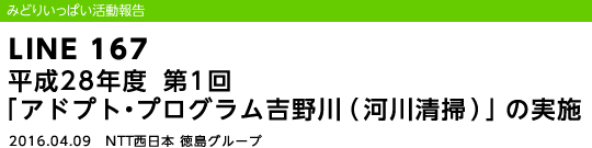「みどりいっぱいプロジェクト」及び「NTT西日本クリーン作戦」の一環でもある「アドプト・プログラム」は、吉野川の河川敷を一定区間に分け、区間ごとに参加者(団体・企業など)を募り、河川敷と参加者を「養子縁組(Adopt)」するものです。