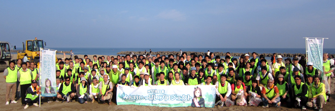 早朝6時40分、晴天になびく「みどりいっぱいプロジェクト」の旗のもと、冨森事業本部長の挨拶で気合を入れ、7時から作業を開始、金沢市専光寺エリアの海岸線約1?を一方向に進みながら、一斉にゴミを回収していきました。