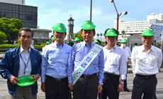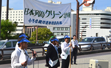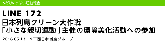 NTT西日本徳島グループは、1班として、空き缶やペットボトル、タバコの吸い殻、紙屑などのゴミを約1時間半かけて回収するとともに、参加団体の代表者は、環境美化活動のスローガンである「美しい日本・美しい心」と書かれたタスキを肩に掛けて、「美しい環境」と「あたたかな心の輪の広がり」の大切さについての呼びかけを行いました。