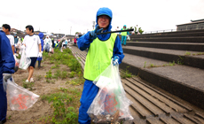 当日は、あいにくの雨模様の天気の中、休日にもかかわらず早朝から富山グループの社員や家族、退職者などの40名を始め、多数の方が参加され、雨に濡れながら約1時間の清掃活動を行いました。