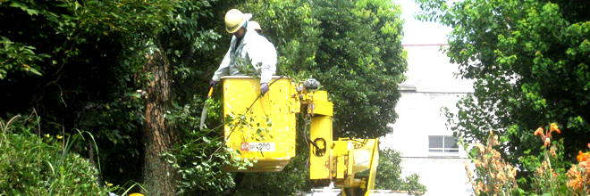 作業はバケット車5台、軽トラック3台を使用しての剪定や清掃を行いました。