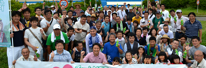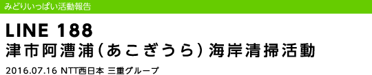 平成28年7月16日(土)NTT西日本三重グループは、「NTT西日本みどりいっぱいプロジェクト」の一環として、伊勢湾に面した三重県津市の阿漕浦海岸で、三重県漁業協同組合連合会主催によるボランティア清掃活動に参加しました。