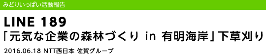 ホーム の中の 企業情報 の中の NTT西日本グループのサステナビリティ の中の みどりいっぱい活動報告 の中の LINE 189 「元気な企業の森林づくりin有明海岸」下草刈り