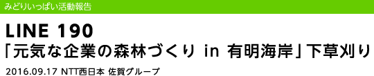 平成28年9月17日(土)、NTT西日本佐賀グループは、佐賀県杵島郡白石町(きしまぐんしろいしちょう)有明海岸沿岸の干拓地で下草刈りを実施しました。
