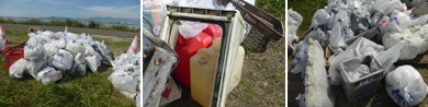 活動成果として、燃えるゴミ20袋、燃えないゴミ45袋(資源ゴミ含む)、自動車のタイヤ、ゴムホース(硬質)、鉄板、流木、発泡スチロールの箱、コンテナ(プラスチック製・木製)、ポリタンクなど、中には大型ゴミもあり、前回4月の実施時よりたくさんのゴミが集まって大きなゴミの山ができました。