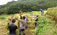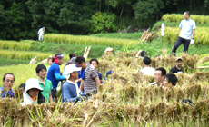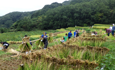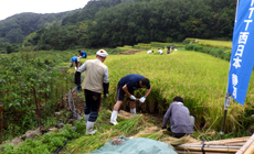 地元の方々に稲刈りからハザ掛けまでの指導を受け、作業開始です。