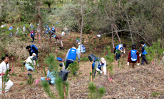 その後、県内各地から集まったボランティア参加者は同森林公園内の塩路県有林に移動し、森林の枝打ち、下草刈り、松の木の植栽活動を行ないました。