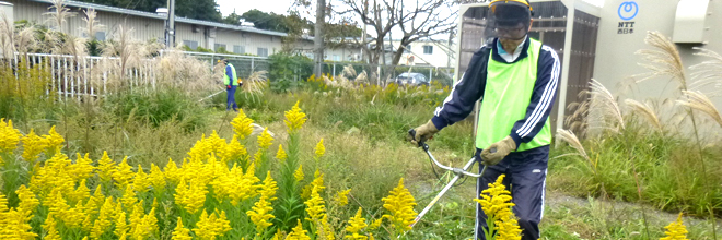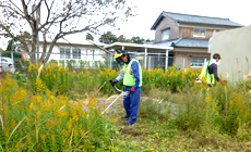 除草する対象の敷地の面積は約100?から800?を超えるものまでさまざまで、ススキやヨモギ、葛(くず)などの在来種のほか、北アメリカ原産のキク科の多年草で外来種の代表ともいえる「セイタカアワダチソウ」などが生い茂り、鬱蒼としているところもあります。