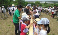 植樹後、活動に参加された社員とご家族のコミュニケーションの場として流しそうめんイベントを行いました。 流しそうめん文化の世界展開をめざす世界流しそうめん協会により、全長25mの竹製流しそうめん台と協会公認のそうめんスライダーが会場に設置され、青空の下、子どもから大人まで流しそうめんを楽しみました。