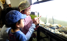まず初めに、近畿大学農学部環境管理学科 北川准教授より本活動の趣旨等を説明していただいた後、学生の皆さんで運営している里山ミニ水族館を見学させていただきました。小さい水族館ではありますが、子どもたちはじっと水槽の中を見たり、カメを触ったりして、大喜びでした!また、北川准教授が「この魚は・・」と説明を始めると、興味深く静かに聞いていました。