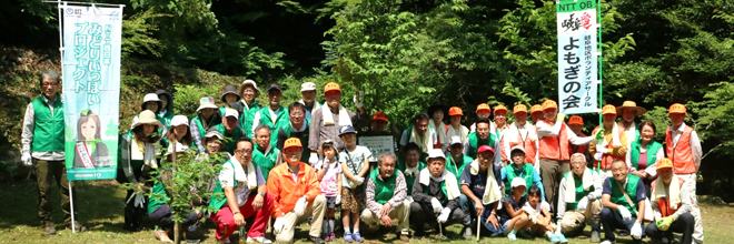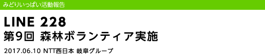 平成29年6月10日(土)、NTT西日本岐阜グループは岐阜市三田洞にある「ながら川ふれあいの森」において、植樹や下草刈りの森林ボランティア活動を実施し、社員とその家族、退職者ボランティア「よもぎの会」から総勢57名が参加しました。