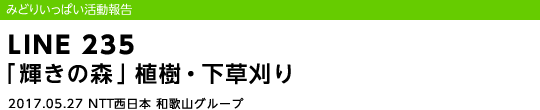 平成29年5月27日(土)、NTT西日本和歌山グループは、和歌山県が推進する「企業の森」事業の森林環境保全活動の一環として、田辺市龍神村にある「輝きの森」で植樹及び下草刈りを実施しました。