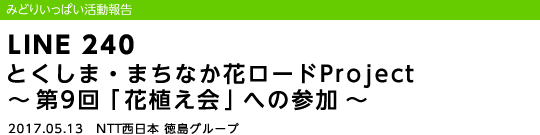 平成29年5月13日(土)、NTT西日本徳島グループはみどりいっぱいプロジェクトの一環として、NPO法人「新町川を守る会」が実施する「とくしま・まちなか花ロードProject」の「第9回花植え会」に参加しました。