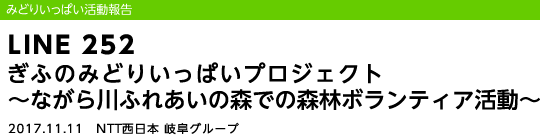 平成29年11月11日(土)、NTT西日本岐阜グループは岐阜市三田洞(みたほら)にある「ながら川ふれあいの森」にて、下草刈りや清掃の森林ボランティア活動を実施しました。
