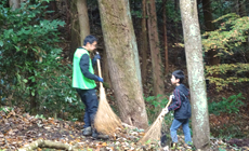 活動当日は、未明まで続いた雨のため、現地には濡れた落葉がたくさん散らばっており、足下も滑る中での作業となりました。しかし、草刈り機を駆使して奮闘する大人たちに交じって、参加した子どもたちも慣れない竹ぼうきや熊手を手に懸命に作業に向き合い、頑張っていました。