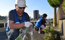 鹿児島グループの参加者はNTTロゴの入った青いビブスを着用し、ビニール袋を片手に約1時間、地域住民の皆さんと挨拶を交わしながらクリーン作戦に取り組みました。参加者は汗だくになりながら懸命に、ゴミ拾いや草取りに専念し、収集されたゴミは総計900キログラムにも及びました。