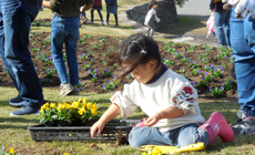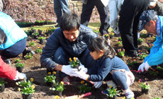 まずは、育苗ポットに入ったビオラを花壇へ数列、等間隔に仮置きし、次にポットから丁寧に苗を取り出し、スコップで穴を開けて植え付けていきました。子どもたちも大人たちと一緒になって懸命に取り組みました。