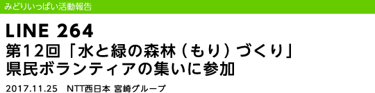 平成29年11月25日(土)、公益社団法人 宮崎県緑化推進機構が主催する第12回「水と緑の森林づくり」県民ボランティアの集いが開催されました。NTT西日本宮崎グループは「みどりいっぱいプロジェクト」の一環として、グループ各社ならびに関係会社の社員とその家族約50名が参加しました。