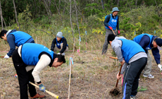 宮崎グループはヤマモモやマテバシイなど6種類の苗木の植栽を行う班に割り当てられました。参加者は「風に負けない大きな木に育って欲しい」との願いを込めて苗木を一本一本丁寧に植え、倒れないように、竹の支柱にくくりつける作業を行いました。