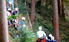 間伐作業を体験する班は高知森林組合の方にヘルメット、軍手、のこぎりをご用意いただき、現場へと向かいました。坂道を下った先の作業場所は急斜面でしたが、子どもも大人も力を合わせてのこぎりを使い、無事に大きなヒノキを4本伐り倒すことができました。