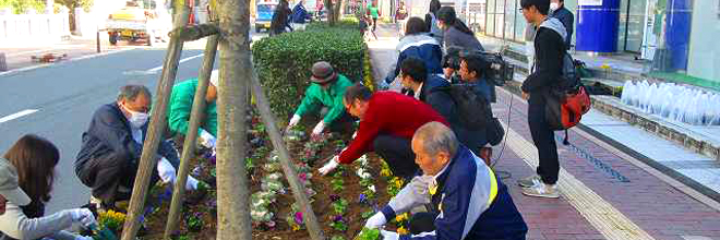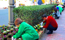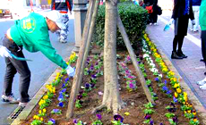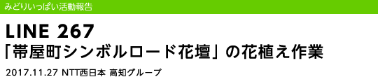 平成29年11月27日(月)、NTT西日本高知グループは高知市の中心部、帯屋町商店街に設けられた「帯屋町シンボルロード花壇」でパンジーやビオラなど880株の花の植替え作業を行いました。