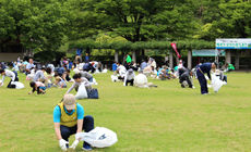 当日は、香川グループ及び協力会社の社員や家族をはじめ、OB会、日本公衆電話会、そして新たに、香川大学のボランティアサークルが加わり、1歳から88歳までの総勢約300名が参加し、芝生広場と藤棚周辺の清掃活動を実施しました。
