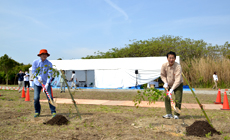 開会式では、社会課題をICTで解決するNTT西日本の役割と、植樹活動がSDGs※の面においても環境を保護する上で大変重要、という上間取締役からのメッセージに続き、上間取締役、寺西大阪南支店長による記念植樹を行いました。