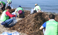 清掃活動では、可燃ごみや不燃ごみ、さらに海岸に打ち上げられている自然ごみ(海藻、木くずなど)などに分別して回収しました。中でも自然ごみは水分を多く含むためかなり重く、ビーチの端から端へと移動し回収場所まで運ぶにも一苦労です。熱中症で倒れる人が出ないか心配でしたが、参加者のご協力のおかげで無事に清掃を終えることができました。