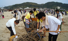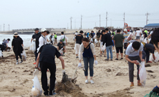 参加者は、海水浴場に投棄された空き缶やビン、ペットボトルのほか、波によって大量に打ち上げられたロープや海藻などの漂着物を分別回収していきます。さらに新入社員によって結成された「リヤカー隊」によるごみ回収サポートもあり、砂浜は本来の美しさを取り戻すことができました。