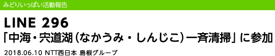 平成30年6月10日(日)、NTT西日本島根グループは松江市と宍道湖水環境改善協議会が主催する「中海・宍道湖一斉清掃」に参加しました。