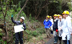 はじめに、活動場所であるNTTドコモ岩屋無線中継所へ徒歩で移動し、東海グループ代表挨拶に続いてNPO法人「穂の国森づくりの会」森田事務局長より里山づくりの重要性や作業内容についての説明を受けました。その後、参加者は安全用のヘルメットを被り、のこぎりを腰に着用して作業を開始しました。