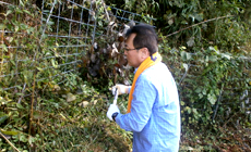 参加者は、棚田のある山の斜面で草刈り機を使った除草作業をしたり、伸びてワイヤーフェンスに絡みついた蔓(つる)をカマで取り除いたりと、安全に気を付けながら草刈りを行いました。