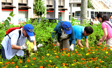 オープニング・セレモニー終了後は7班編成となり、徳島駅前から阿波踊り会館・あわぎんホール前・市役所前に設けられた花壇や植樹帯などの指定場所に移動し、マリーゴールド(オレンジ色・黄色・混合の3種類)27,000株の植栽活動がスタートしました。