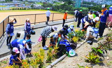 参加者は熱中症予防対策として小まめに水分補給をしながら、事務局が準備した約1,400本の苗木(クロヨナ、シャリンバイなど6種類)を、ゆたか小学校の花壇に植えていきました。