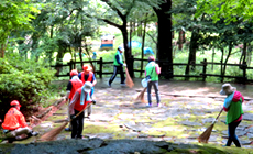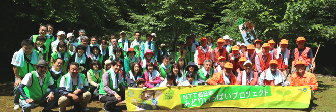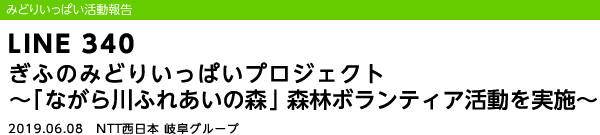 2019年6月8日(土)、NTT西日本岐阜グループの社員やその家族のほか、退職者ボランティア「よもぎの会」など総勢73名が、岐阜県三田洞(みたほら)にある「ながら川ふれあいの森」において、下草刈りや清掃などの森林ボランティア活動を実施しました。