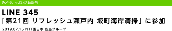 ホーム の中の 企業情報 の中の NTT西日本グループのサステナビリティ の中の みどりいっぱい活動報告 の中の LINE 345 「第21回 リフレッシュ瀬戸内 坂町海岸清掃」に参加