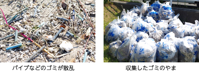 参加者は可燃ごみや不燃ごみ、海岸に打ち上げられたプラスチックごみ、木くずなどの自然ごみを分別して回収しましたが、細分化された発泡スチロールやパイプは手で拾うことしかできず、苦労していました。