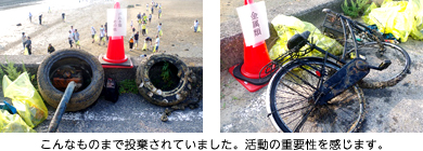 干潮の影響で足元がぬかるむ中、海岸に打ち上げられたプラスチックごみや木くずなどの自然ごみを分別して回収しましたが、不法投棄されたタイヤや自転車などは、ヘドロがついて重量がさらに増していたため、かなり手間取りました。