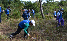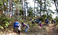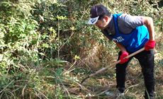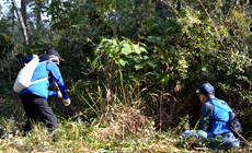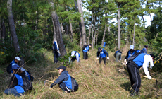 その後、県内から集まったボランティア参加者など総勢約500名が指定のエリアに移動し、森林の枝打ちや下草刈りの作業を開始しました。鬱蒼(うっそう)と生い茂る雑草を日ごろ使いなれない鎌で悪戦苦闘しながら刈り、約1時間半ほどで作業を終えました。