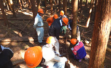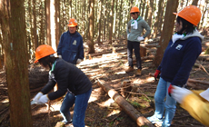 間伐作業では、津市林業振興室の方が見守る中、5人ずつのグループに分かれてヒノキが林立する森の中へ入りました。森林組合の方による間伐作業のお手本を見学した後、ご指導を受けながら作業開始です。参加者は木にノコギリで切り目を入れ、ロープを引っ掛けみんなで力を合わせて引っ張り、木を倒しました。