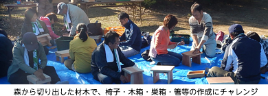 木工教室では木工用のキットが用意され、森から切り出した材木を活用する作業について森林組合の方に教わり、椅子や木箱、巣箱、箸づくりにチャレンジしました。参加者の多くが童心に帰ったように夢中になって創作に取り組み、時折楽しそうな話し声や笑い声が響く、和やかなひとときとなりました。