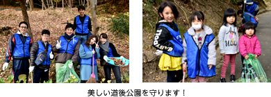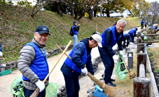 参加者は、まず丘陵地の排水溝にたまった落葉や泥を木々の根本に散布し、遊歩道に飛散する落葉を回収するなどの作業後、公園内の休憩所・庭園のごみ拾いや草引きをしました。