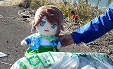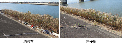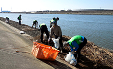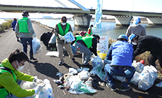 最初にセレモニーが行われた後、参加者は2班に分かれて徒歩で清掃場所まで移動しました。一時間ほどの作業で快い汗を流し、終わる頃には堤防沿いに回収したごみ袋の山ができました。