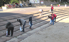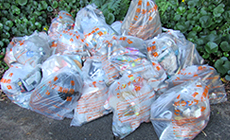 参加者はビニール袋と火はさみを手に、海岸付近に散乱するごみを一つひとつ拾い集めました。作業を終える頃には、ペットボトルや空き缶、ビニール袋など、大きなごみ袋約40袋分のごみが集積されました。