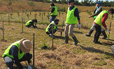 参加者は植樹方法の説明を受けた後、間隔をあけて掘った植穴に苗木をはめ込み、肥料を混ぜ合わせた土を埋めて、仕上げに成長の過程で木が倒れないように添え木をして根本をしっかりと踏み固めました。