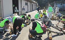 なめこの植菌体験では、桜の原木にドリルで穴をあけ、木槌を使ってその穴に種菌を植えつけました。普段できない体験に、参加者の皆さんは黙々と作業に取り組んでいました。