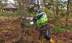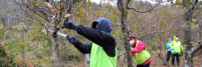 志賀町火打谷エリアでは、クヌギの剪定と、なめこの植菌体験を行いました。剪定とは、樹木の枝葉を切り落として形を整え、風邪通しを良くする作業です。枝葉を落とすことで栄養の分散を防ぐことにも繋がり、病害虫予防になります。