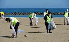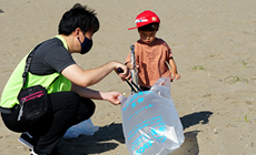 陽が降り注ぐ砂浜で、額に汗しながら懸命にごみを拾う参加者に混ざって、砂遊びをしつつごみ拾いをする子どもたちの表情には真剣な中にも笑顔があふれていました。そんな子どもたちがまずは海で楽しみ、海をきれいにすることを学んで環境保全の大切さを感じてもらえたらと思いました。