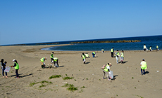 28日の白山市徳光海岸での活動は、北陸グループの参加者が揃いの黄緑色のビブスを着用し、「みんなで頑張るぞ」の掛け声で清掃場所500メートルの海岸線の隅々まで漂着ごみや家庭ごみを回収していきました。
