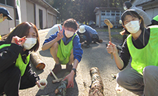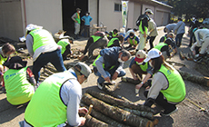 また、なめこの植菌体験では桜の原木にドリルで穴をあけて、木槌を使いその穴に種菌を植えつけました。体を屈めての作業は思いのほか大変で、参加者にとっては慣れない体験でしたが、皆さんは協力し合い懸命に取り組んでいました。